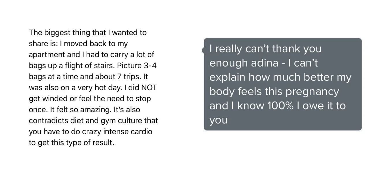 But based on the hundreds of women that have gone through this program before you I can say that if you show up for yourself at least 2 days a week - at the end of 14 weeks you WILL feel stronger and more energized! A few weeks in you should already start gaining way more body awareness, start feeling stronger and have strategies to get yourself out of pain.